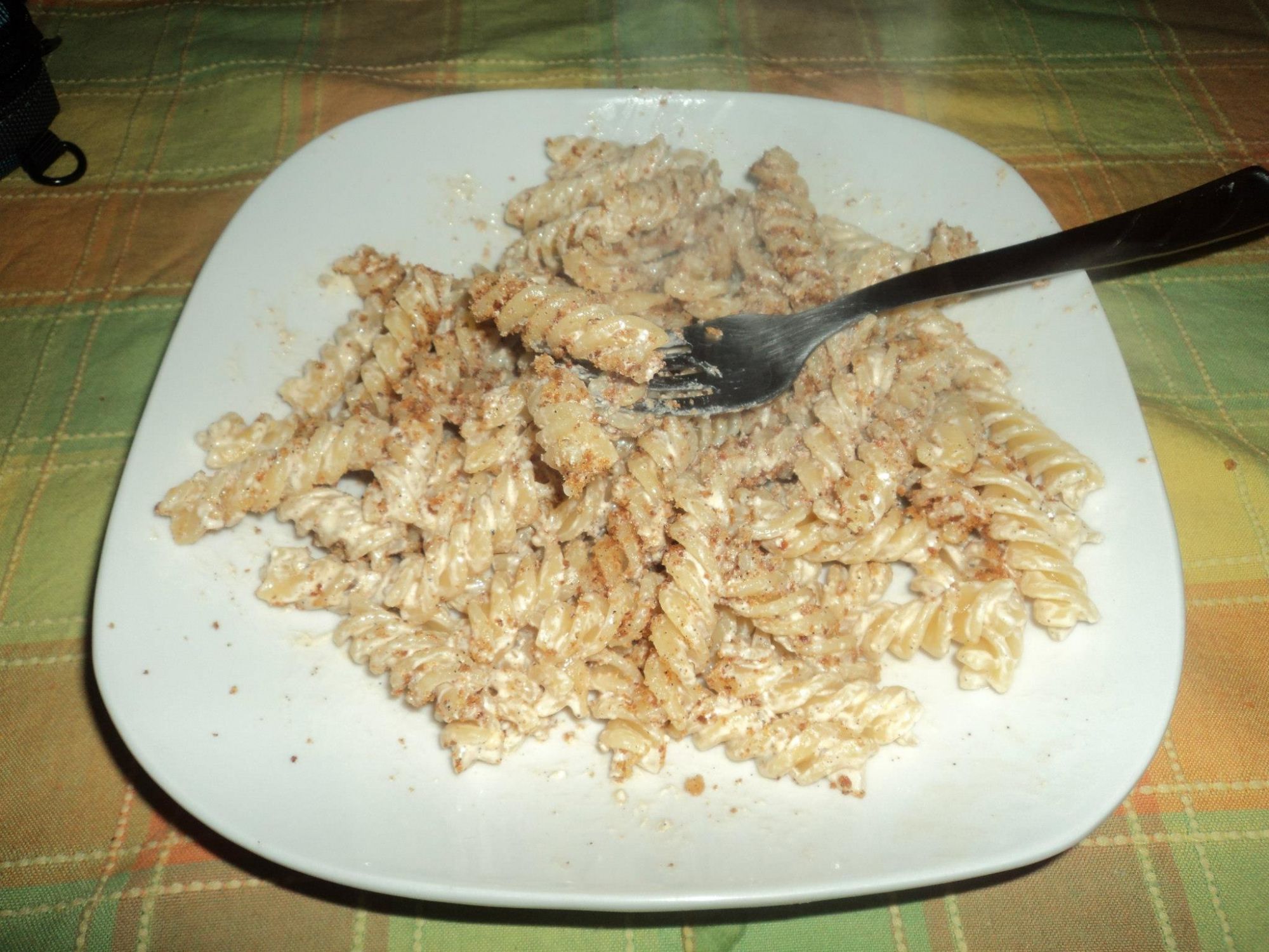 Fusilli con cipolla tonno e panna cosparso di pangrattato abbrustolito.