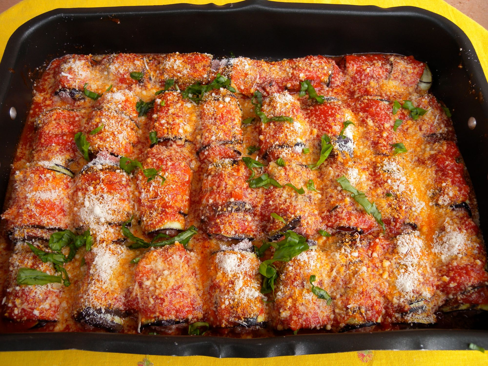 Ricoprire, nell'ordine, con il rimanente sugo, foglie di basilico sminuzzate e parmigiano. Passare nel microonde per 5' o nel forno tradizionale, precedentemente riscaldato a 200 , finchè il parmigiano non si sarà sciolto. E' ottima servita tiepida, ma anche fredda non è male.