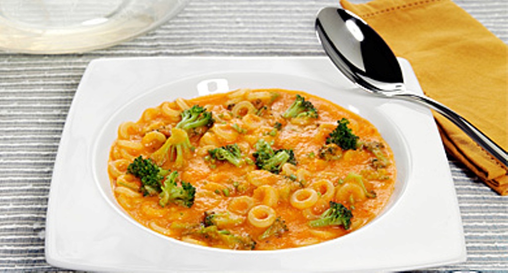 In una casseruola fate imbiondire la cipolla finemente tritata nell'olio, aggiungete aglio tritato, peperoni e pomodori tagliati a pezzetti privati dei semi. Fate cuocere per 10'. Frullate tutto al mixer e mettete nel tegame con il brodo, unite i broccoli sbollentati a pezzetti, cuocete per 15', salate e pepate. Cuocete gli Anellini nella zuppa e guarnite con erba cipollina tritata.