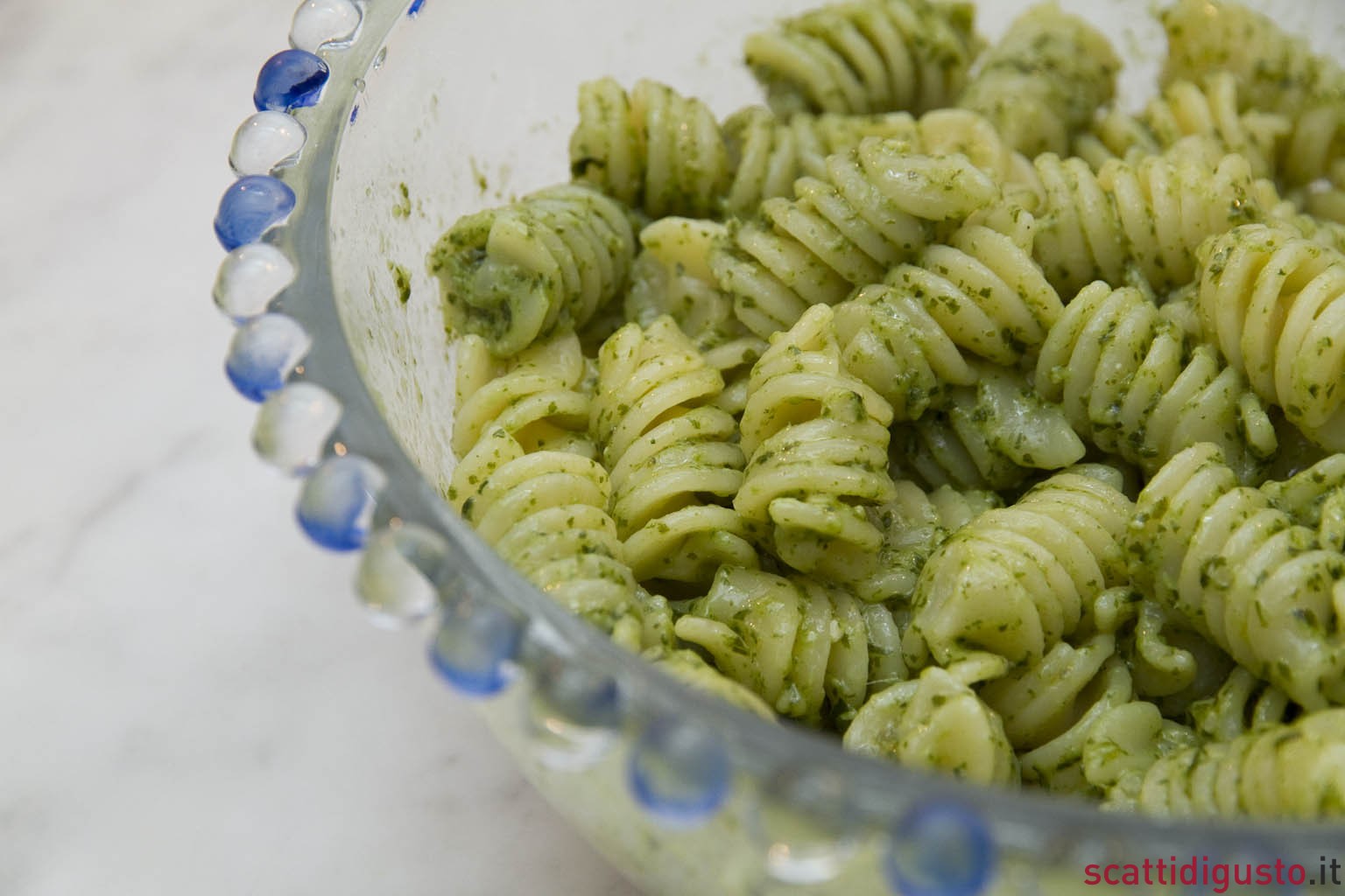 Per ammorbidire il pesto light, aggiungi 2 cucchiai di acqua della pasta, unisci l’olio e frulla nuovamente. Una volta ottenuto un pesto light cremoso e omogeneo, aggiungilo agli spaghetti appena scolati e mischiando bene, amalgama la pasta al pesto per qualche secondo a fiamma moderata.