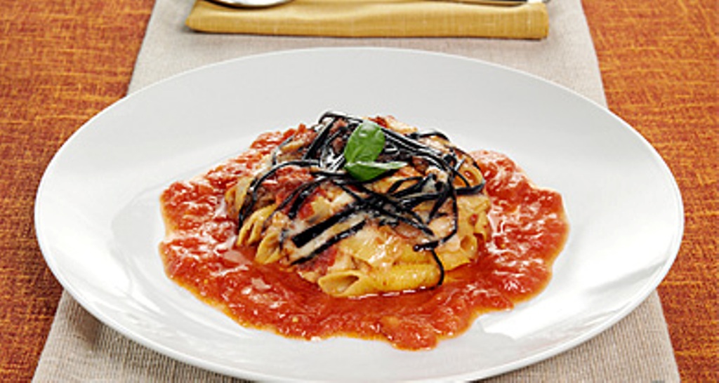 Lavare le melanzane, sbucciarle e tagliarle a dadini, quindi metterle in acqua salata per dieci minuti. Strizzarle, asciugarle e friggerle in padella con poco olio bollente fino a che non imbiondiscono. A parte friggere le pelli. Lavare i pomodori e tagliarli a metà, eliminare i semi e metterli in una padella a cuocere insieme a olio, aglio schiacciato e un pizzico di sale per dieci minuti, fino ad ottenere una salsa. In una padella unire due cucchiai di questa salsa, le melanzane, la provola tagliata a tocchetti, qualche foglia di basilico. Cuocere i Garganelli in abbondante acqua salata, scolarli al dente e aggiungerli al composto. Imburrare una terrina, distribuire sul fondo le pelli fritte delle melanzane e i Garganelli conditi e cuocere in forno a 200 ° per 5 minuti. Versare due cucchiai di salsa in un piatto, capovolgere le terrine per versare il contenuto nei piatti e guarnire.