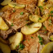Praticare dei taglietti lungo i bordi delle braciole, affinché non si arricciano in cottura e metterle a cuocere sopra una piastra calda ( o come me, in una padella a pietra), senza olio, girando dai due lati, (circa 4-5 minuti per parte, girandole più volte). Nella stessa padella, pulita dai residui, mettere un po' di olio e appassire la cipolla per 1 minuto, aggiungere le braciole, le mele, insaporire di sale e pepe e sfumare con il vino e cuocere finché evapora a fuoco medio. Guarnire con prezzemolo tritato e servire caldo.