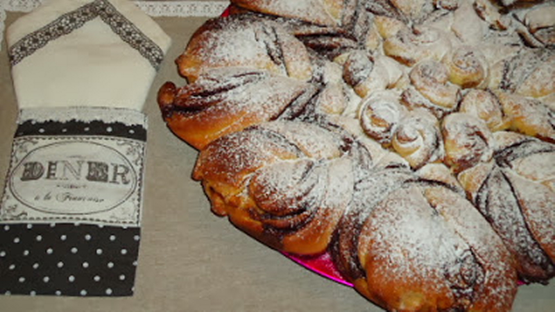 Ora sollevate 2 spicchi ed effettuare il primo giro dal centro verso l’esterno e poi il secondo. Ripetere il procedimento anche con gli altri spicchi, poi richiudete bene le punte in modo da realizzare dei petali. Disponete al centro del fiore le roselline e lasciate lievitare un'altra oretta.