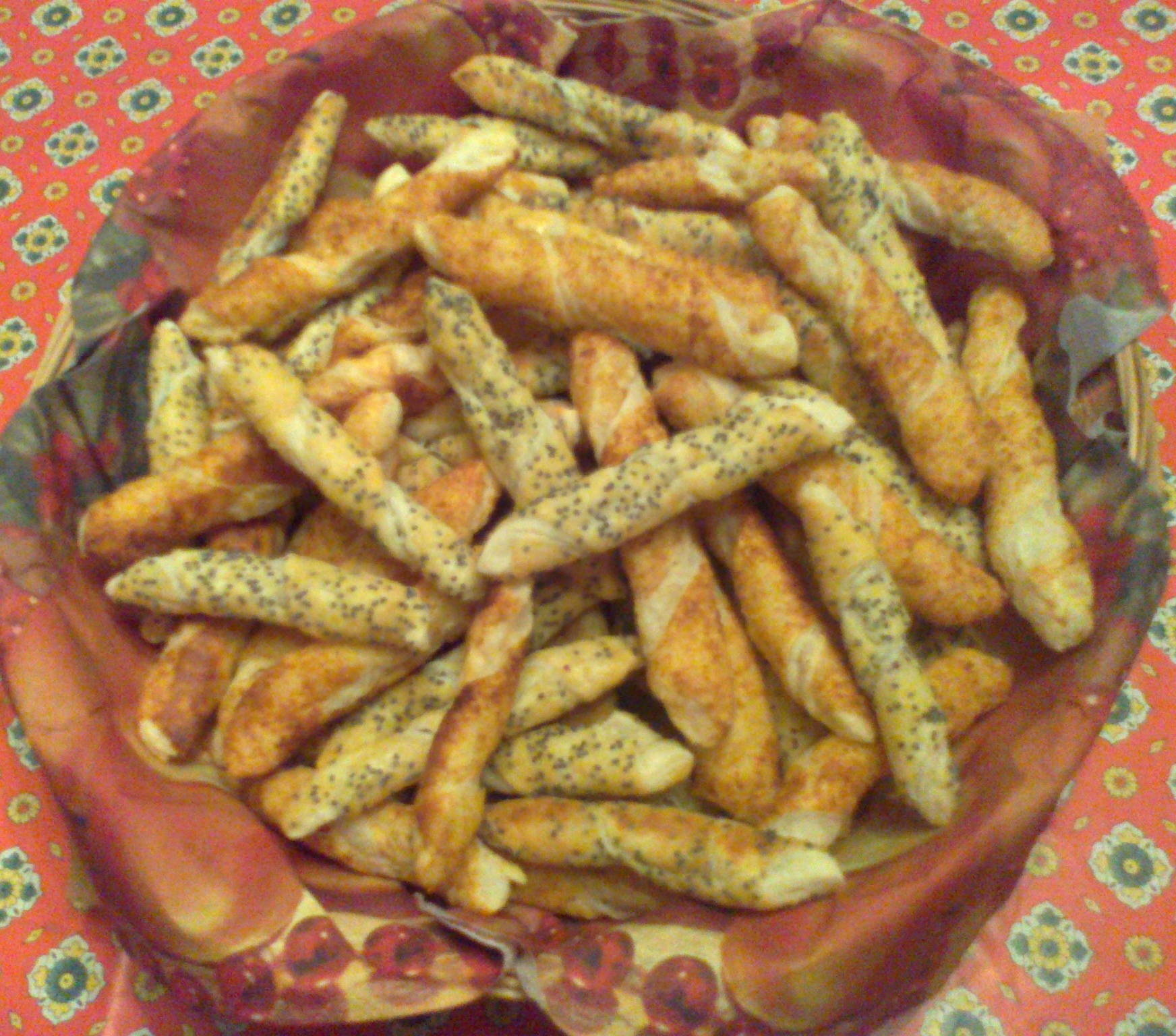 Srotolare la pasta sfoglia e bucherellarla. spennellare con l'uovo sbattuto e spargere su tutta la superficie il parmigiano grattugiato e le spezie desiderate (un tipo di spezia per rotolo di pasta sfoglia). Battere leggermente la sfoglia in modo che gli ingredienti si attacchino bene alla base. Tagliare in tante striscioline abbastanza sottili e attorcigliare ognuna a mo' di elica. Rivestire delle teglie con carta forno, disporre i bastoncini così ottenuti ed infornare a 200 gradi per 10 minuti circa.
