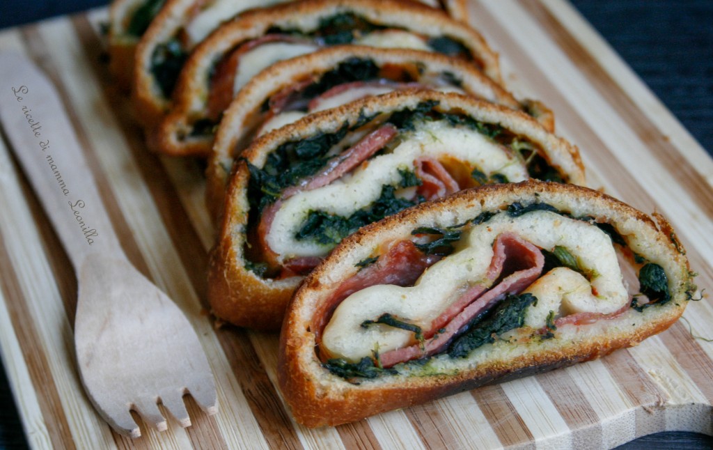 Riprendete l’impasto,stendetelo su un piano infarinato o su della carta forno in un rettangolo di circa 3 mm di spessore e farcitelo con la salsa di pomodoro,gli spinaci,la mozzarella tagliata (io l’ho passata allo schiacciapatate) e il salame. Arrotolate la pizza e ponetelo su una teglia con carta forno avendo l’accortezza di appoggiarlo con la congiunzione rivolta verso in basso.