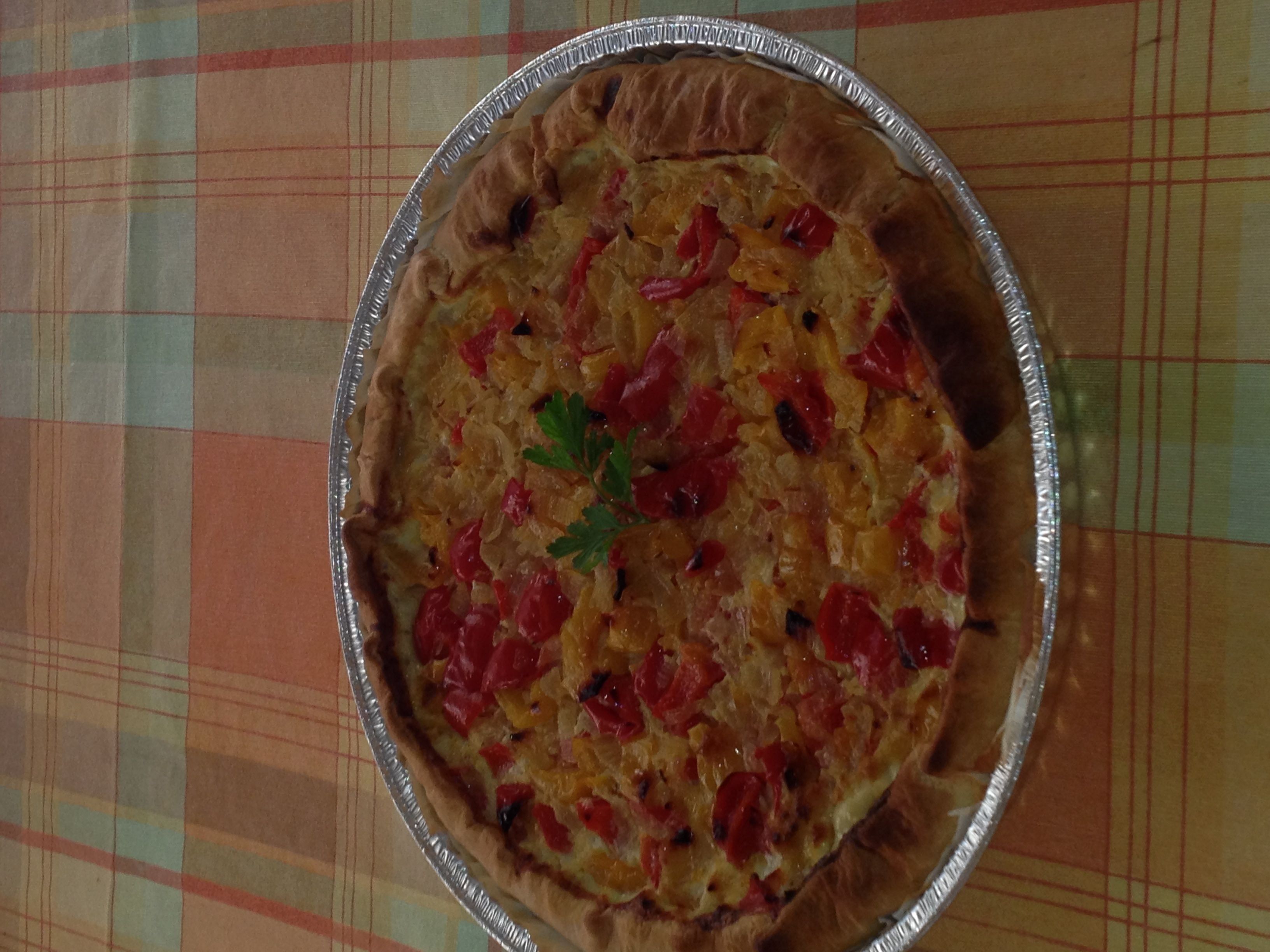 Lavare e mondare i peperoni; tagliarli a striscioline e metterli a cuocere con la cipolla tritata, in una padella con un filo d'olio. Far cuocere per circa 15 minuti. Poi lasciate raffreddare per 15 minuti.