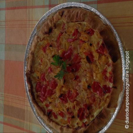 Srotolate la pasta brisee e foderate con essa una teglia tonda di circa 23 cm di diametro. Tenete i bordi sollevati e punzecchiate il fondo con una forchetta. Trasferite i peperoni in una terrina; condite con del prezzemolo fresco; a parte lavorate la ricotta con l'uovo e due cucchiai di parmigiano. Salate e pepate a piacere.