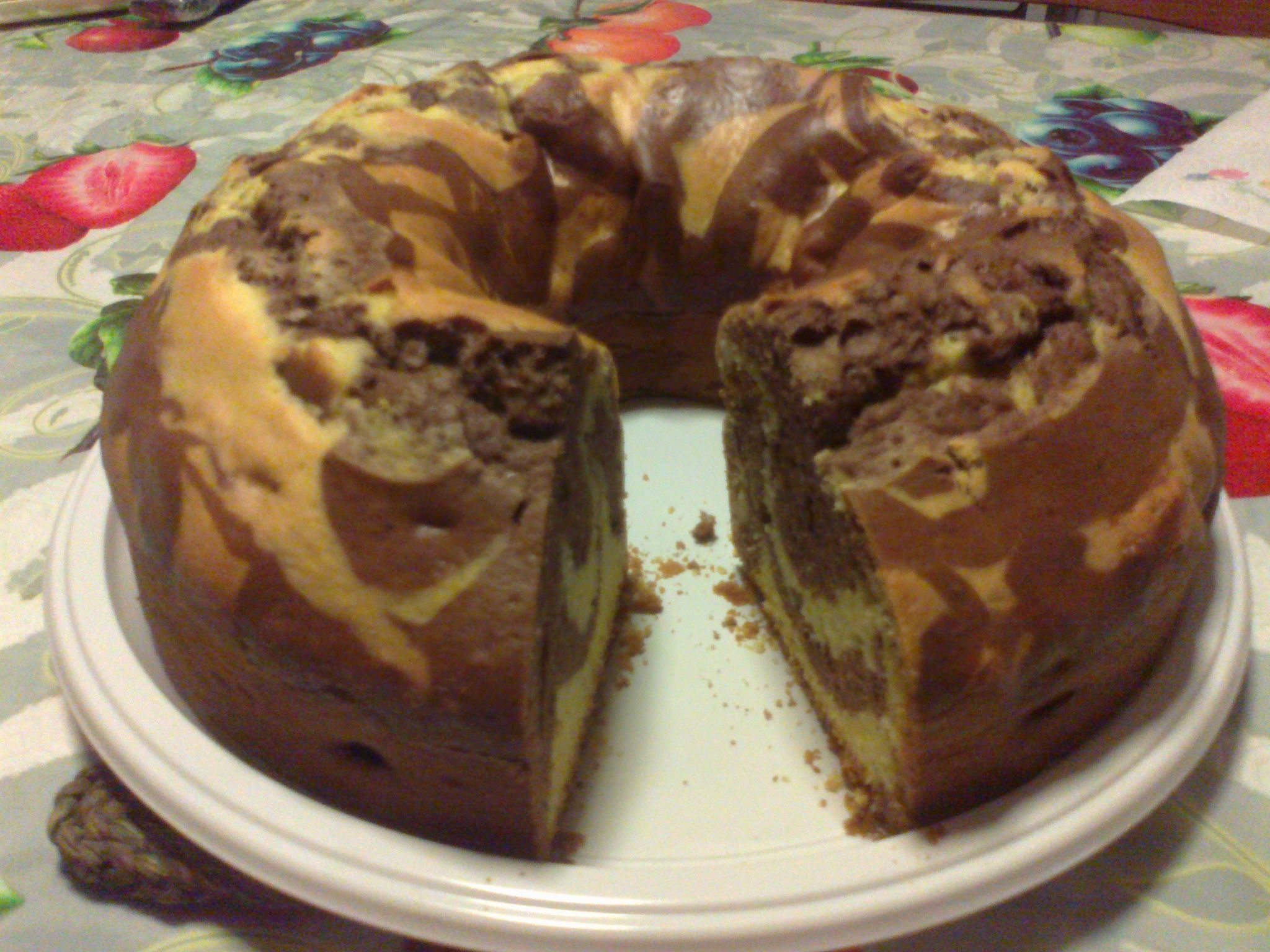 Sbattere le uova con lo zucchero, unire il burro fuso (o l'olio), il sale, il latte, l'aroma, il lievito e la farina. Amalgamare molto bene e dividere il composto ottenuto a metà e su una metà aggiungere il cacao e mescolare. Imburrare ed infarinare uno stampo a ciambella (diametro 28-30 cm), versare i 2 composti alternandoli e cuocere a 180 gradi per 40-45 minuti facendo la prova stecchino. Lasciar raffreddare, sformare e spolverizzare la superficie con lo zucchero a velo.