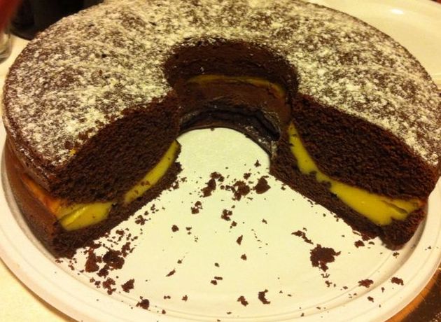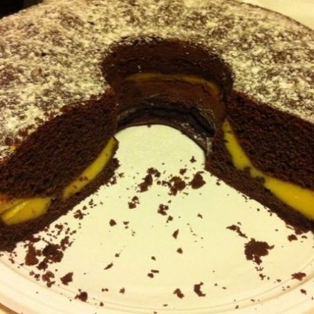preparare l'impasto per la ciambella: sbattere le uova con lo zucchero, unire la farina, l'olio, il lievito, il latte, il cacao ed il sale. amalgamare bene e dividere il composto in 2 parti. preparare la crema: sbattere le uova con lo zucchero, versare il latte, la maizena (o frumina) e l'aroma al rum, porre sul fuoco e far addensare. imburrare ed infarinare uno stampo a ciambella (diametro 28-30 cm), versare metà del composto dell'impasto, versare sopra uniformemente tutta la crema ed infine ricoprire con l'impasto restante. infornare a 180 gradi per 40-45 minuti. far raffreddare, sformare e spolverizzare la superficie con lo zucchero a velo.