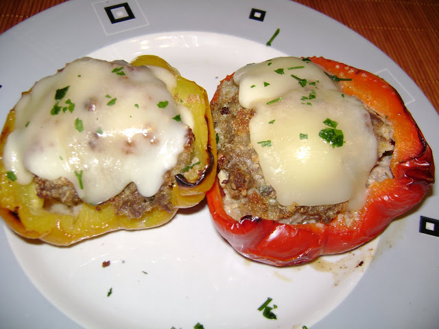 Spolverate con il formaggio grattugiato ed il Parmigiano. Aggiungete il salamino tagliato a fettine. Mettete in forno e fate cuocere per 20-25 minuti, fino a che i peperoni non saranno ben cotti ed il formaggio sarà fuso.
