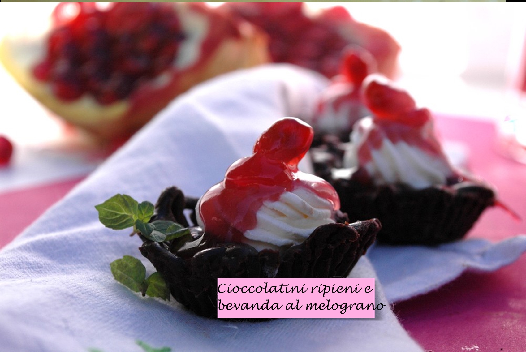 Questo dolcetto parte da una base di cioccolato fondente, con una crema di ricotta e panna e per finire una gelatina di melograno.. il tutto guarnito da un chicco messo in bella mostra e qualche fogliolina di menta..