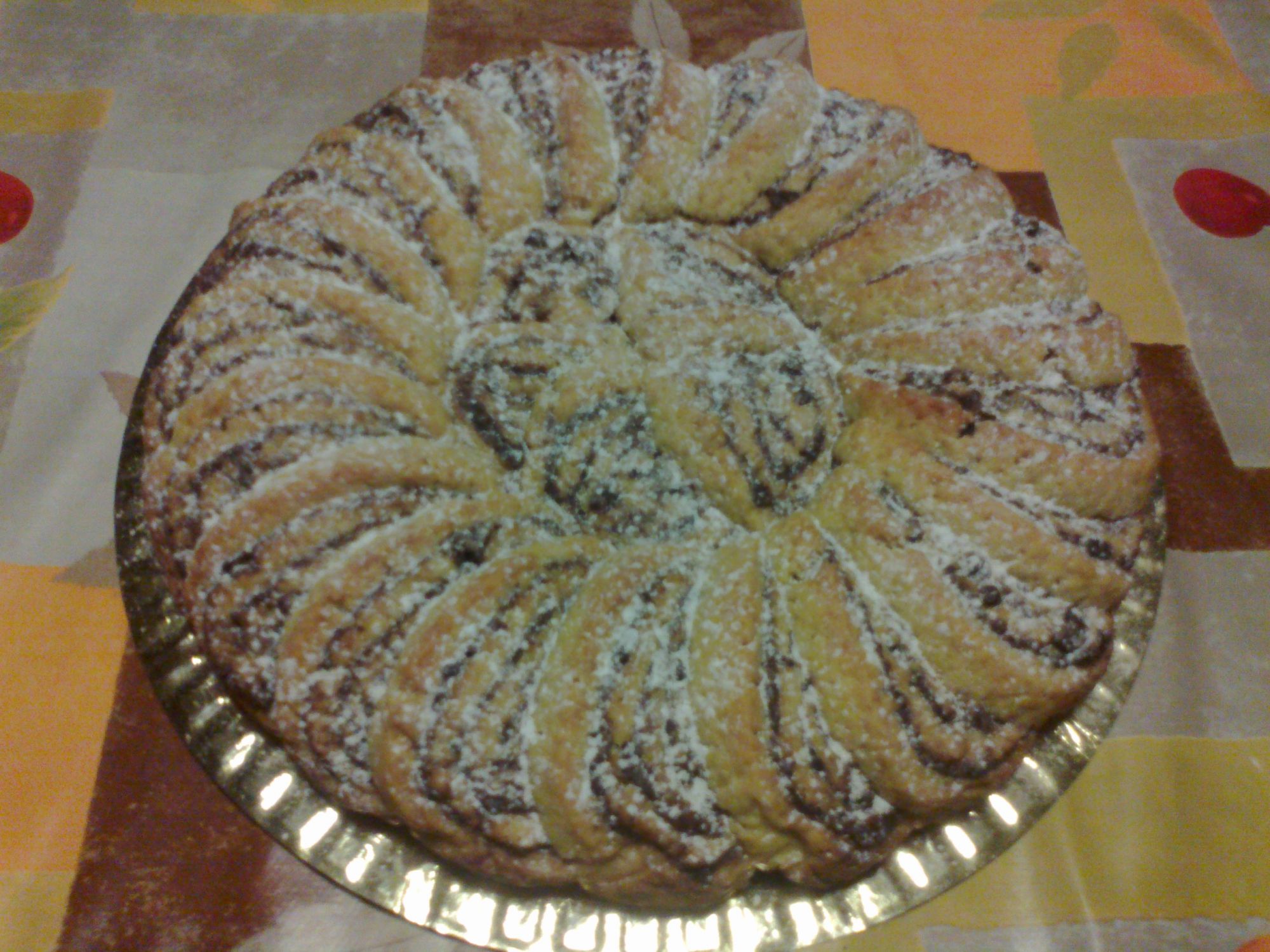 In un'ampia terrina disporre la farina, al centri il burro a pezzetti e lavorare con la punta delle dita fino a formare un composto granuloso. Ora aggiungere lo zucchero, le uova, la vanillina ed il lievito. Lavorare l'impasto aggiungendo man mano il latte fino a formare un panetto omogeneo. Stendere su una spianatoia infarinata dando la forma rettangolare di 35x35 cm dello spessore di circa 3 mm. Spennellare la sfoglia con il burro fuso, spalmare uno strato di nutella sciolta a bagnomaria e sopra cospargere le gocce di cioccolato. Arrotolare l'impasto su se stesso a mo' di salame. Con un coltello a lama liscia tagliare a fette dello spessore di circa 2 cm. Foderare uno stampo a cerniera con carta forno e disporre i rotolini a corona sovrapponendoli leggermente gli uni sopra gli altri. Spennellare con del latte e spolverizzare con lo zucchero a velo. Infornare a 180 gradi per 30 minuti. Freddare e spolverizzare con lo zucchero a velo.