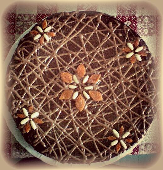 Foderare una tortiera con un foglio di carta da forno, imburrarla, infarinarla, distribuirvi il composto, cuocere in forno a 160 °C per 50 minuti, sformare e far raffreddare la torta. Preparare la copertura: spezzettare il cioccolato fondente e fonderlo a bagnomaria; amalgamarvi il burro a pezzetti, togliere dal bagnomaria, unire zucchero a velo e poca acqua, mescolare ottenendo una crema.