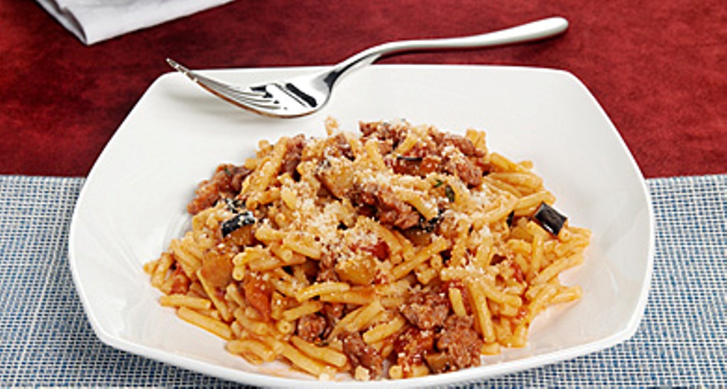 Rosolate le melanzane a cubetti con un cucchiaio di olio. Soffriggete in un'altra casseruola la salsiccia sgranata in poco olio per 3’, quindi unite i pomodori pelati a pezzetti. Aggiungete sale e timo e lasciate cuocere per 10’. Fate cuocere la Gramigna in abbondante acqua salata, scolate al dente e condite con la salsa alla salsiccia e le melanzane. Spolverizzate del Parmigiano Reggiano grattugiato prima di servire.