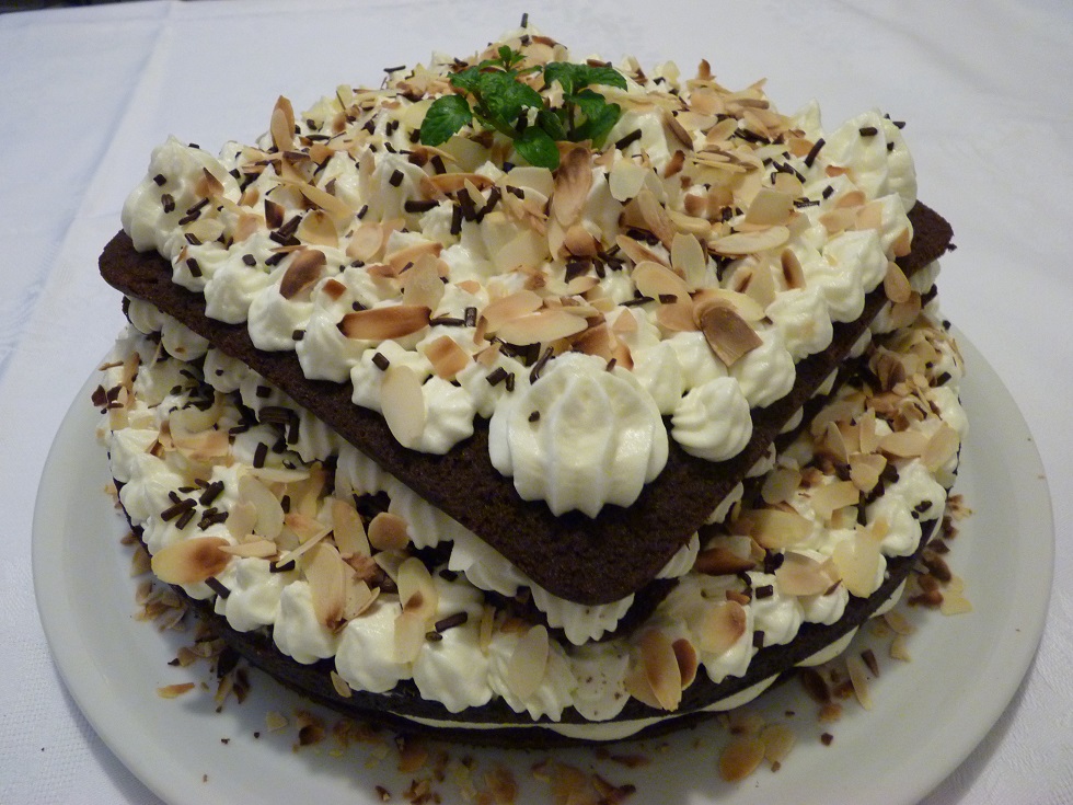 Collocare sopra un piatto da portata uno strato di torta tonda, bagnare a piacere con della bagna, coprire con della crema, distribuire delle scaglie di cioccolato e delle mandorle in lamelle.