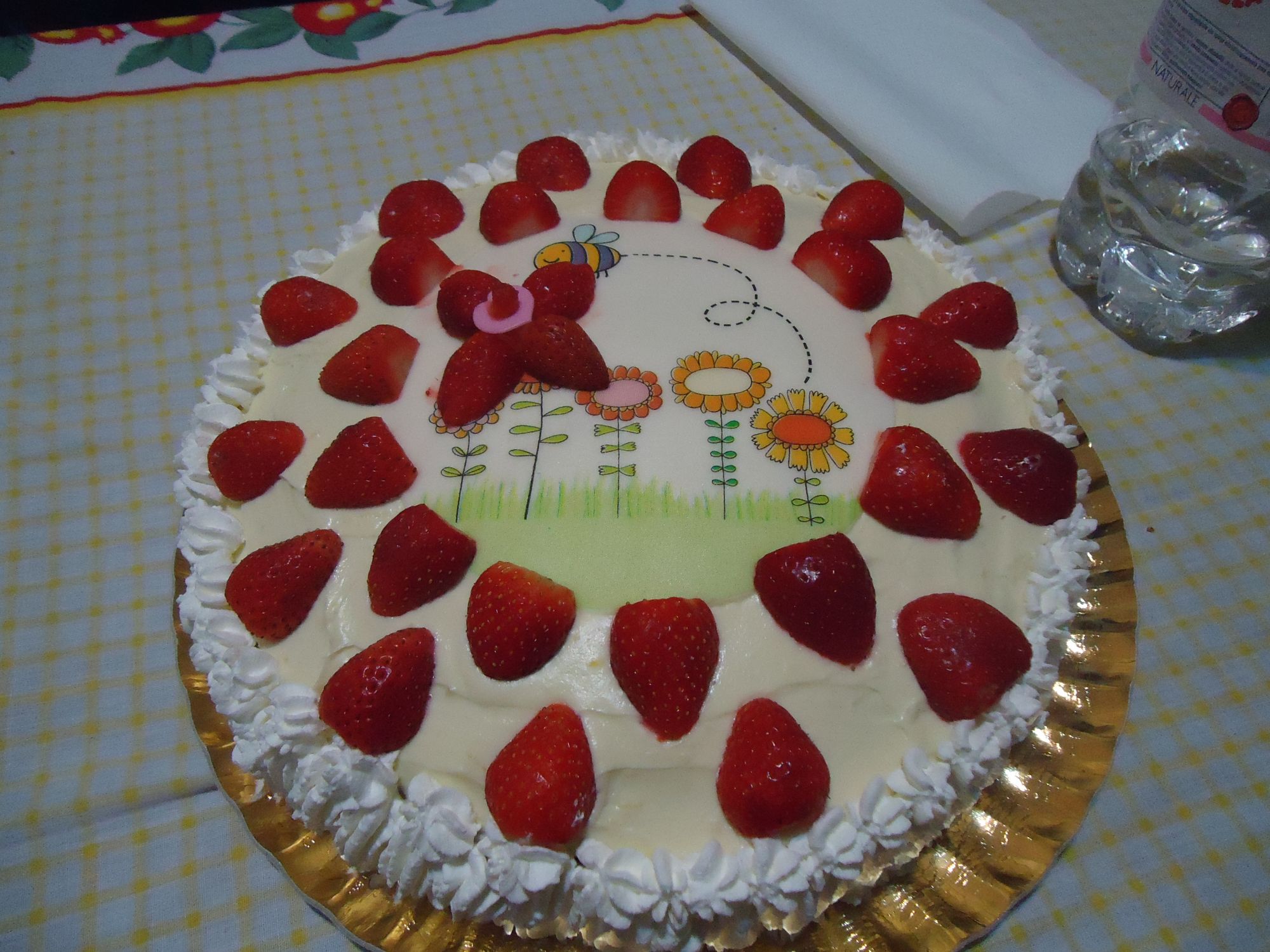 Coprire la torta con la restante crema e decorare con la panna montata e le fragole.
