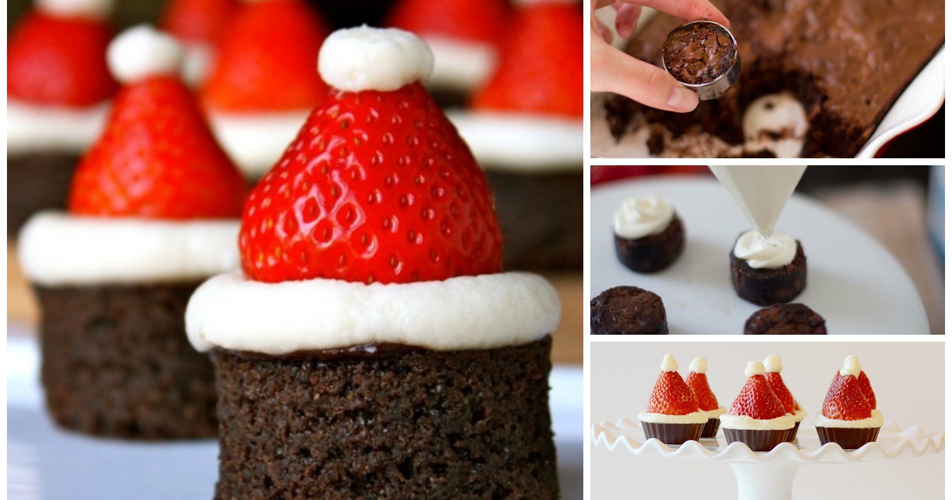 Decorate quindi ogni brownie con della panna montata, una fragola rovesciata ed un ciuffo di panna montata in cima, formando una specie di cappello di Babbo Natale.