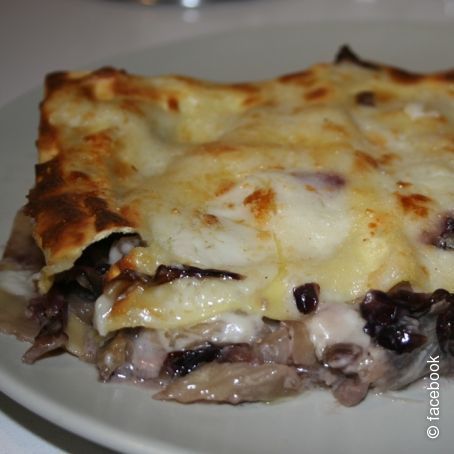 Mettere una sfoglia per lasagna, versare sopra del radicchio, del gorgonzola e delle noce. Mettere un'altra sfoglia e condire con i pomodorini. Ripetere per ambedue i composti.