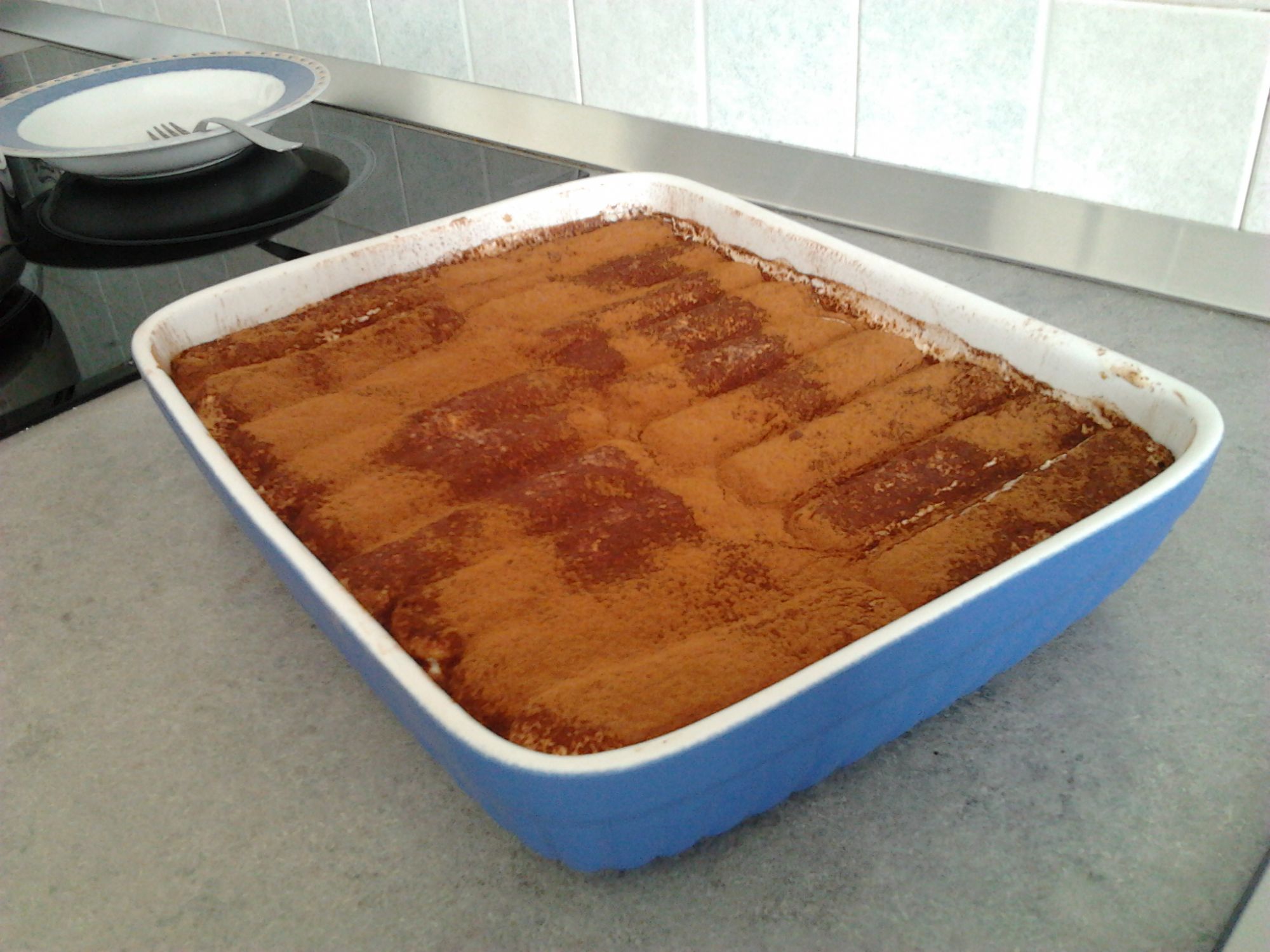 Ricoprite i savoiardi con metà della crema al mascarpone. Fate un secondo strato di savoiardi e l'altra metà di crema al mascarpone(l'ultimo strato deve essere di mascarpone). Spolverizzate la superficie del tiramisù con il cacao amaro.