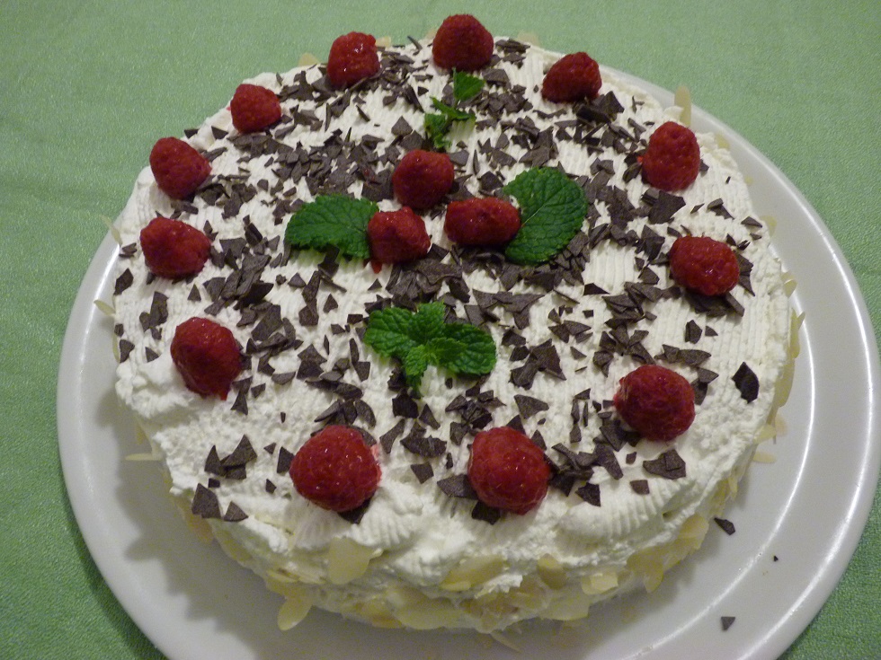 Spalmare tutta la superficie sopra e i bordi con la panna montata, decorare con i lamponi, foglioline di menta, scaglie di cioccolato sopra e lamelle di mandorla sui bordi.