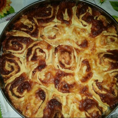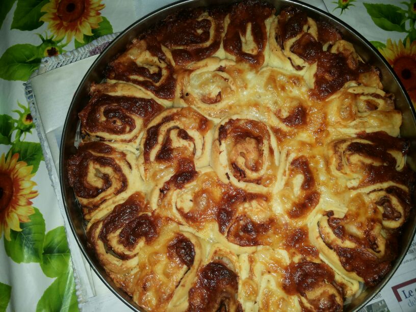 Stendere la pasta con le mani fino a creare un rettangolo. Farcire con il prosciutto e la provola. Arrotolare e tagliare a rondelle il rotolo. Disporre le rondelle una attaccata all'altra in una teglia rotonda con carta forno a riposare per mezz'ora.