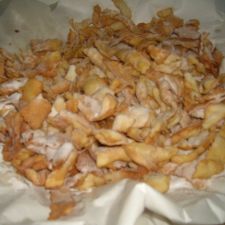 stendere l'impasto sottile sottile. Tagliare la pasta con la rotellina lavorata e immergere in olio caldo (di semi).