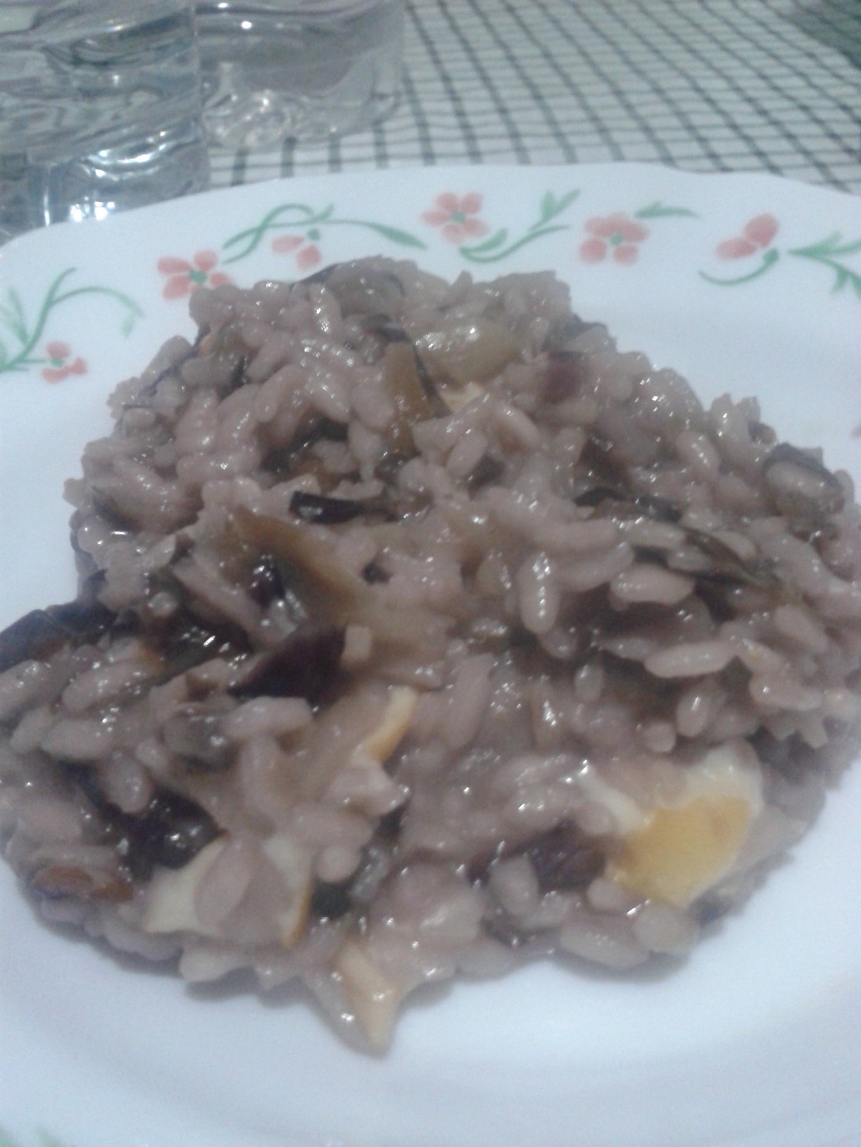 Preparare il brodo vegetale. In una padella soffriggere con un cucchiaio di olio extravergine di oliva la cipolla tritata e aggiungere il radicchio tagliato a listarelle. Quando il radicchio sarà diminuito di volume tostare il riso e sfumare con il vino. Aggiungere poco alla volta il brodo vegetale e portare a cottura il risotto.