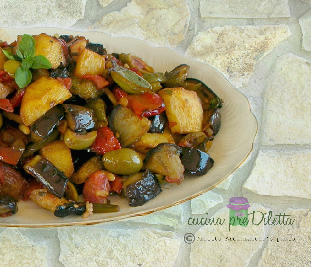 Portare ad ebollizione l'aceto e aggiungere qualche chiodo di garofano e alcuni grani di pepe. Appena l'aceto bolle immergere i peperoni e sbollentare i peperoni per qualche minuto. Scolarli dall'aceto e metterli ad asciugare. Nello stesso modo sbollentare le fette di melanzana e poi asciugarle. Nel barattoli collocare i peperoni e le melanzane alternati e aggiungere acciughe e olive. Mettere una foglia di basilico, un po di prezzemolo tritato e l'olio. Sterilizzare i barattoli per 25-30 minuti.