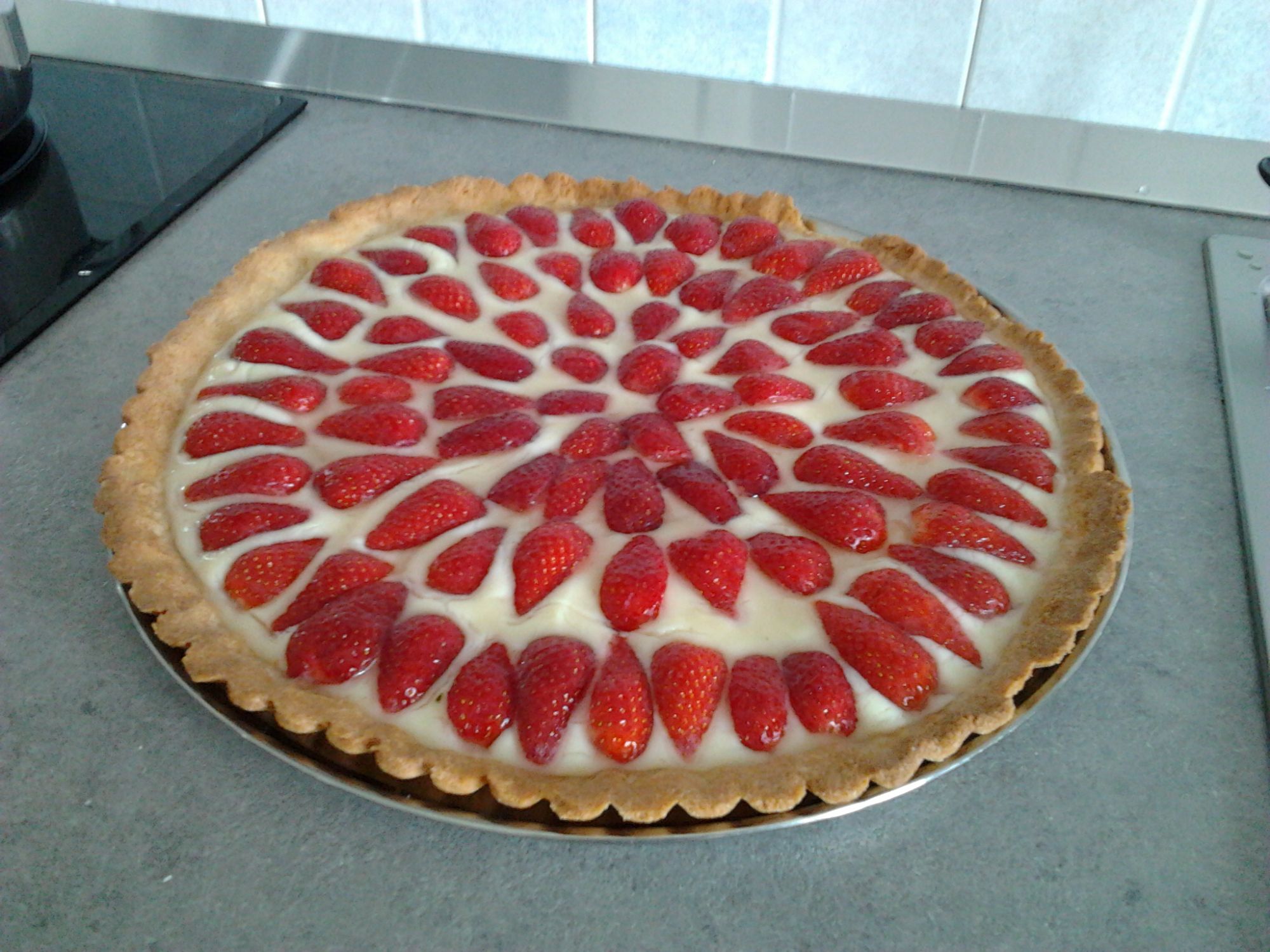 Preparare la crema come da ricetta. Quando la frolla è cotta lasciare raffreddare e toglierla dalla teglia. Versare sulla torta la crema ancora calda e quando sarà fredda guarnirla con le fragole. Ricoprire il dolce con un velo di gelatina e servirlo freddo.