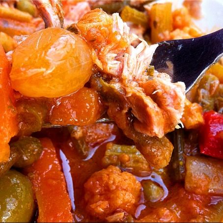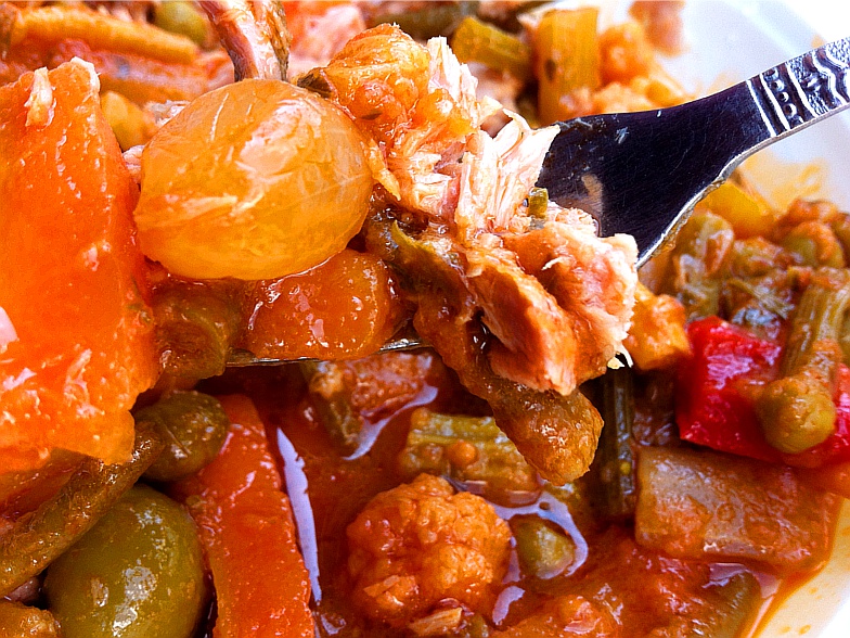 Pulire le verdure e tagliarle a pezzetti piccoli. Metterle in una casseruola a distanza di una decina di minuti prima le carote, poi i fagiolini, il sedano, le cipolline e infine i peperoni e le olive. Aggiungere il sale a metà cottura e la passata di pomodoro e fare cuocere a fuoco basso senza coperchio. Quando le verdure saranno tutte cotte aggiungere l'olio e l'aceto. Al momento di servirlo a piacimento si puo aggiungere una scatoletta di tonno spezzettato.