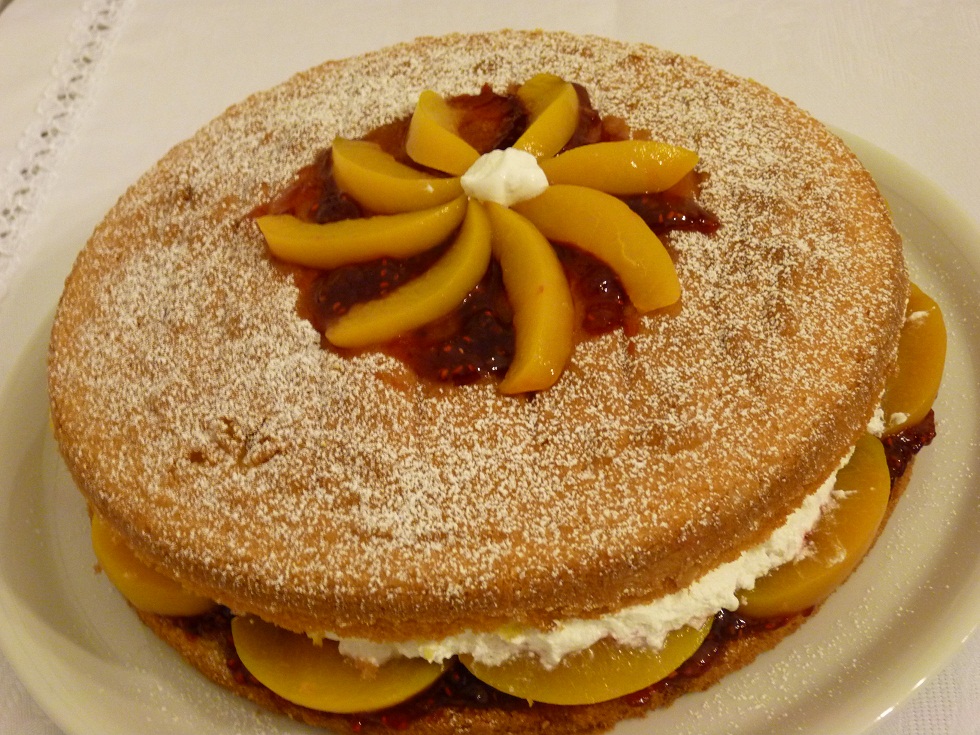 Lavorare la margarina con lo zucchero e la vaniglia, unire le uova una alla volta, mescolare brevemente ed incorporare la farina con il lievito, il sale ed il latte. Mettere nella tortiera imburrata ed infarinata e cuocere a 180° x 35 min.(prova stecchino). Lasciare raffreddare e tagliare in due dischi. Montare la panna con l' aroma di vaniglia. Mettere un disco su un piatto, spalmare con la confettura di lamponi, coprire con un strato di pesche a fettine, distribuire sopra la crema alla vaniglia e coprire con l' altro disco. Spolverizzare con zucchero a velo. Decorare a piacere con fettine di pesca.