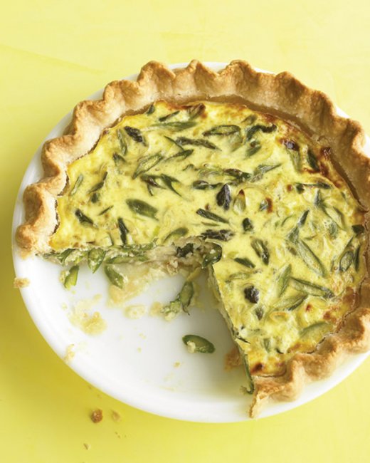 Disponete la pasta brisè in una teglia tonda foderata di carta da forno, bucherellate il fondo con una forchetta e versate il ripieno.