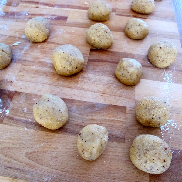 Fare ammorbidire il burro e poi impastare tutti gli ingredienti insieme. Formare dei salamini come per i gnocchi e poi tagliare a pezzetti. Infornare a 180° per 20 minuti.
