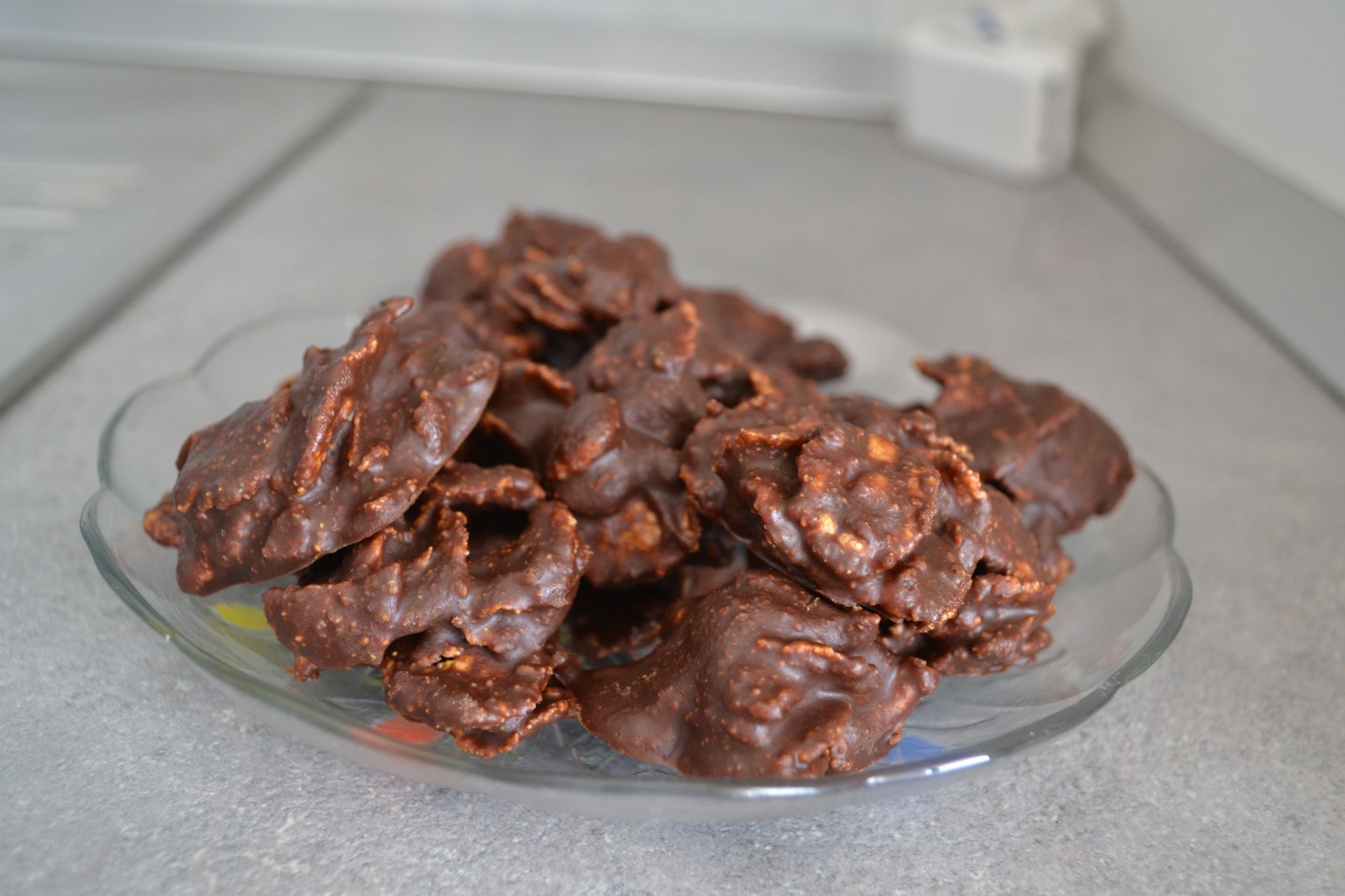 Sciogliere il cioccolato con il burro. Tritare 25 g di cornflaks con lo zucchero a velo e aggiungere il cioccolato fuso. Trasferire in una ciotola, unire il miele e i cornflaks interi, mescolare delicatamente.