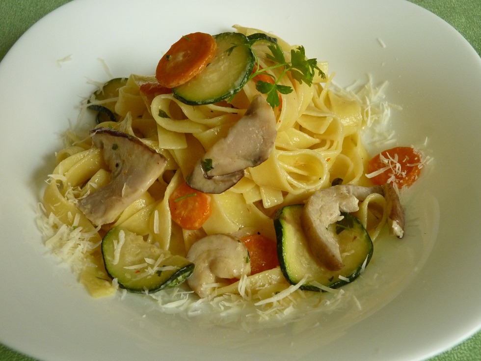 In una larga padella appassire la cipolla nel olio per 2 minuti insieme al aglio, aggiungere le zucchine, le carote cuocere 5 minuti, unire anche i funghi, insaporire di sale , pepe e miscela di spezie a piacere e proseguire la cottura per altri 10 minuti a fuoco moderato, girando ogni tanto.