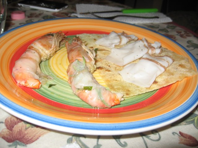 Cospargere la mazzancolla con un pò di rosmarino(3/4 aghi a pezzo) e arrotolarla nel lardo.