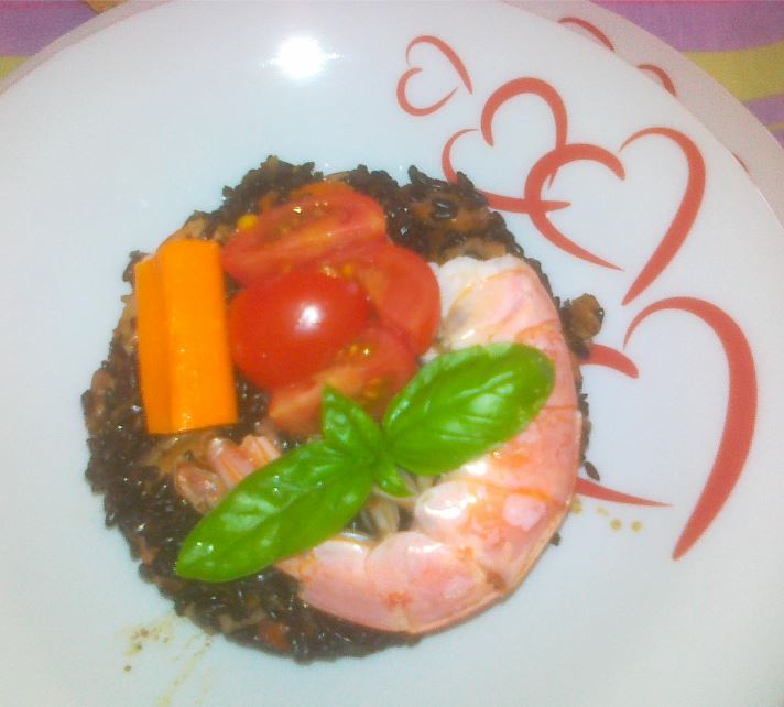 Mettete in una casseruola l’olio insieme ad uno spicchio d’aglio e aggiungete le zucchine e i gamberi, fate cuocere per 10 minuti e quando sarà cotto, aggiungete il riso venere.