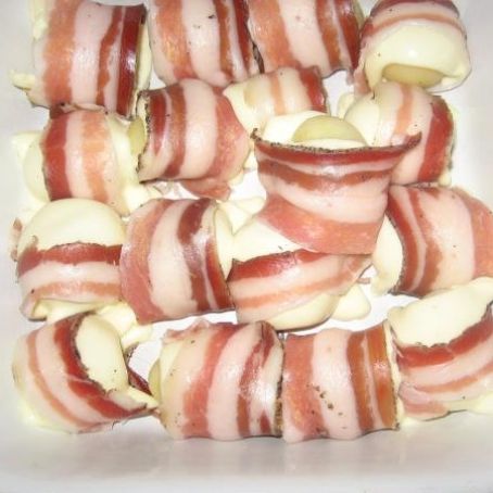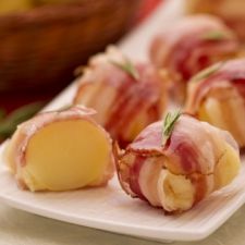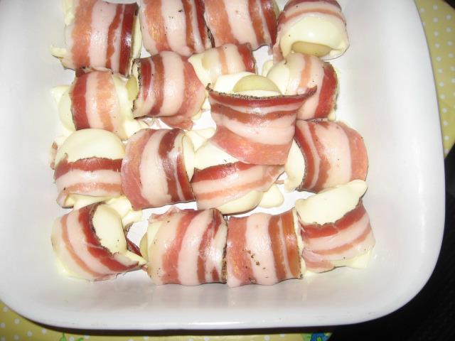 Tagliare le fettine di formaggio in 2 e arrotolare ogni patata prima con il formaggio e poi con il rigatino.