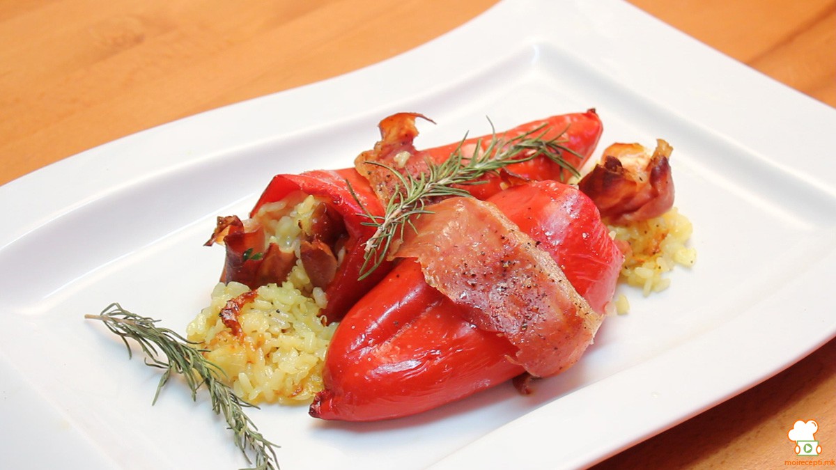 Fase 6: Posizionare la padella con i peperoni nel forno riscaldato a 150 gradi, cuocere 25 a 30 minuti, fino a quando il pepe è ammorbidita e diventa croccante di prosciutto affumicato.