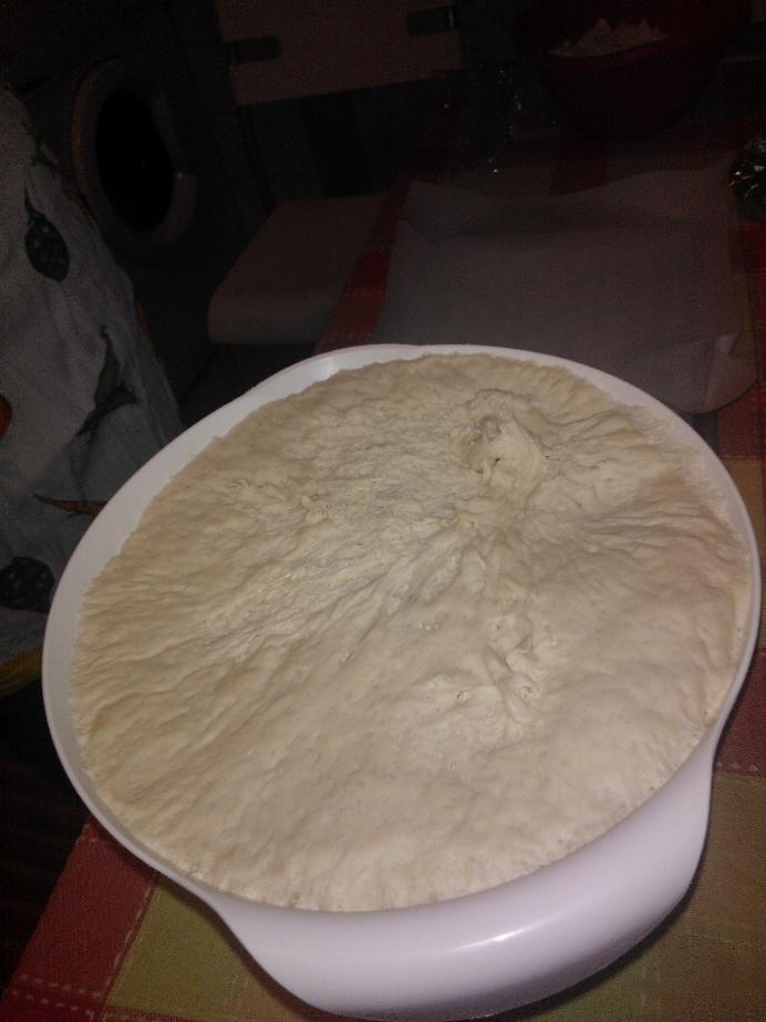 Per prima cosa fate sciogliere il lievito in una ciotola con un po d'acqua e fate riposare. In un'altra ciotola fate sciogliere il sale,sempre con un po d'acqua. Passiamo alla farina;versare un kg di farina in un recipiente abbastanza capiente e fate un buco al centro. Versate per prima il lievi e poi a seguire tutti gli altri ingredient ( l'acqua un po per volta)i. Mescolate il tutto con le mani e una volta raggiunta la consistenza esatta continuate sul piano di lavoro e sbattete l'impasto pr 2/3 volte su un piano resistente...per concludere in una ciotola pulita mettete sul fondo un po di farina e ponete dentro il vostro panetto di pizza e copritelo con un canavaccio pulito. Ponete la ciotola in un luogo caldo ( non forno) o anche sotto un piumone e fare riposare per 2/3 ore!