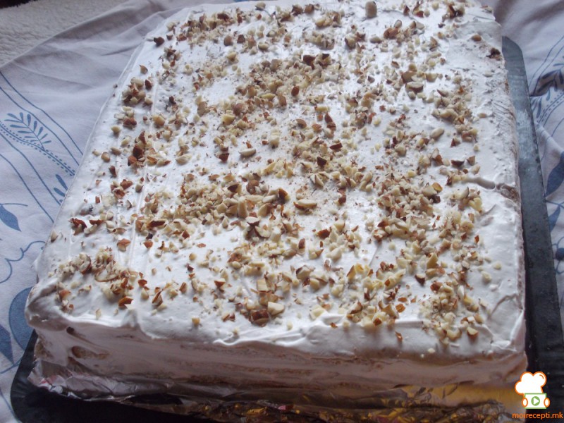 Белките одделете ги од жолчките, белките изматете ги со прстофат сол во мек снег, постепено додавајте 1 по 1 лажица шеќер, матете додека добиете цврст снег, додадете ги жолчките и уште малку матете. На крајот додадете ги останатите состојки и измешајте со лопатка да се соединат. Смесата излијте ја во плехот, израмнете и ставете да се пече, печете доека зарумени и проверете со чечкалица дали излегува сува кога ќе ја забодете. На истиот начин подгответе ги и другите 2 кори.