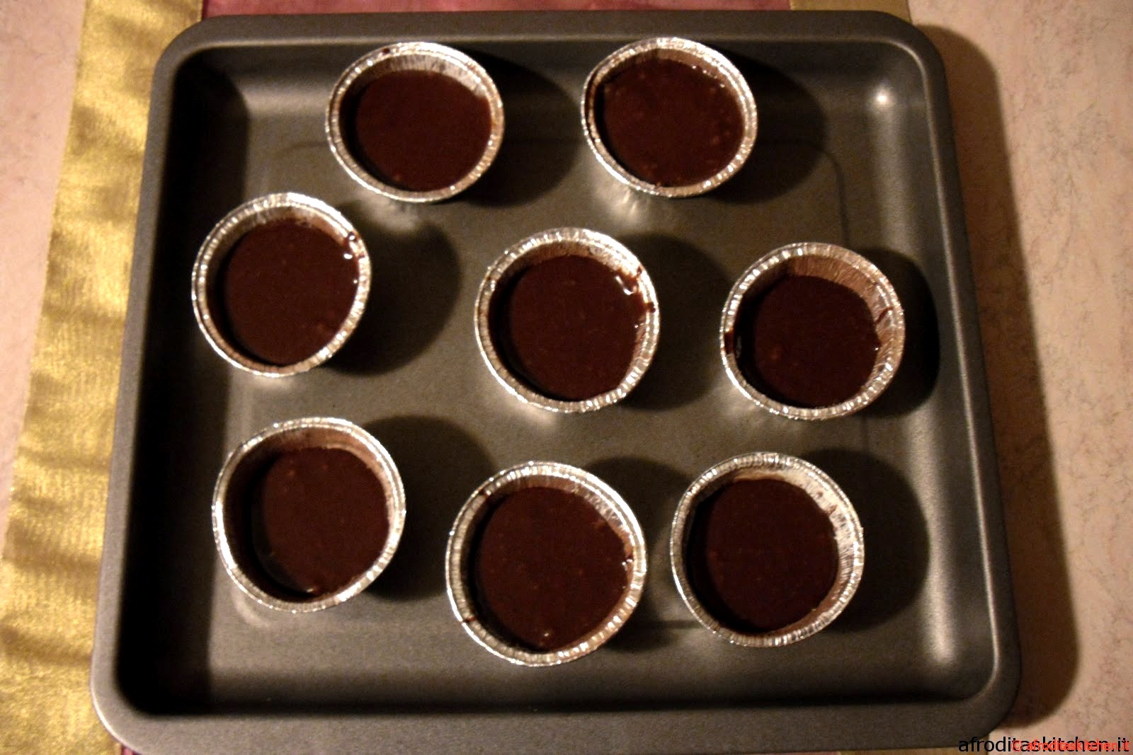 Imburrate i pirottini e infarinateli...versatevi un cucchiaio colmo di composto e infornate a forno caldo 180° per 10 minuti.Fate attenzione all cottura perchè il tortino non deve cuocere molto...quando vedete che il bordo è cotto e al centro è ancora sgonfio...toglieteli dal forno.