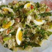 Quando l' acqua inizia a bollire, salare e mettere il riso. Cuocere per 5 minuti, dopodiché unire gli asparagi tagliati, i fagiolini e cuocere per altri 5 minuti. Trascorso il tempo unire le punte di asparagi, i pisellini e proseguire la cottura altri 5 minuti. Scolare e sciacquare sotto acqua fredda.