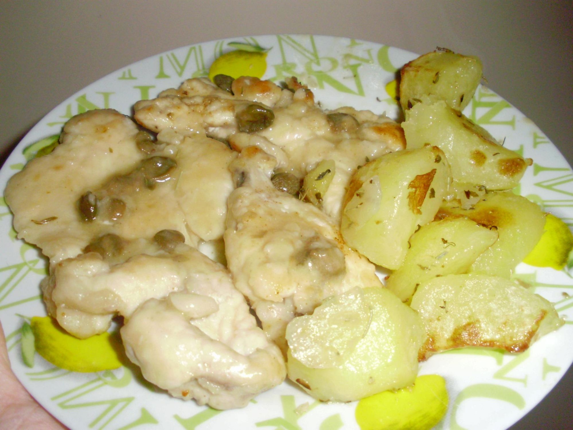 Preparare la farina con sale e pepe, infarinare le fettine di pollo e fare rosolare con olio e rosmarino in una padella. Aggiungere il vino, fare evaporare un po', i capperi e il succo di limone. Fare cuocere a fuoco lento per dieci minuti. Come contorno ho preparato delle patate precedentemente lessate mezza cottura con cipolla e sale e dopo le ho fatte gratinare con olio rosmarino e origano.