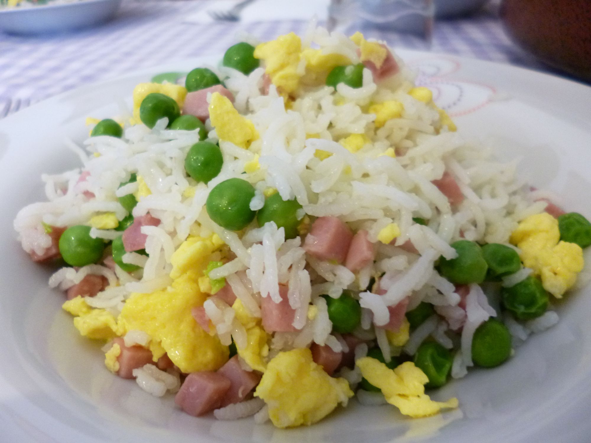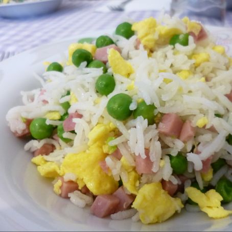Cuocere il riso con i piselli surgelati, sbattere un uovo con la soia nella pentola con un filo d'olio fino a diventare straccetti.