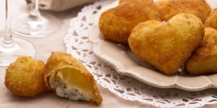 Stendete l’impasto dei cuoricini con un mattarello formando una sfoglia rettangolare dello spessore di circa 1-2 mm al massimo: con un cucchiaino, prendete un po’ del ripieno e adagiatelo a mucchietti sulla sfoglia, a distanza di circa 10 cm uno dall’altro. Coprite i mucchietti con la pasta (chiudendola a libro) e con lo stampino a forma di cuore ritagliate le sagome. Procedete in questo modo, impastando ogni volta i ritagli fino all’esaurimento degli ingredienti. Una volta ottenute tutte le sagome, prendete due piatti: in uno metterete il pangrattato e nell'altro l'uovo sbattuto. Intingete ogni cuoricino prima nell’uovo sbattuto, quindi passatelo nel pangrattato e friggetelo in olio moderatamente caldo (non bollente) fino a dorare entrambi i lati. Scolate i cuoricini, adagiateli su carta assorbente da cucina e serviteli immediatamente.