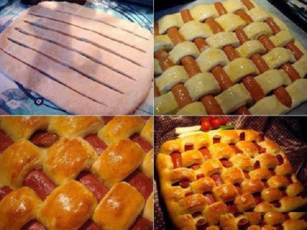 Impasta tutti gli ingredienti e forma una palla e lascia lievitare un paio di ore. Stendi la pasta su una teglia rettangolare rivestita da carta da forno. Incidete almeno sei righe lineari senza andare fino in fondo, come si vede nella foto uno entrambi i lati non dovete inciderli. Ora inserite i wurstel partendo dal basso per uscire dall'alto fino a riempire tutta la superficie e quindi dare l'effetto della scacchiera. Spennellate tutta la superficie con un tuorlo e pochissimo latte. Infornate a 180 gradi per circa 30 minuti. Potete anche utilizzare la pasta sfoglia il procedimento e' identico, magari usare più' strati di pasta sfoglia.