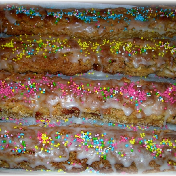 Dopo la cottura vanno spennellati con acqua e zucchero cotti che noi chiamiamo" cileppo" e spolverizzati di zucchero colorato e anicini.