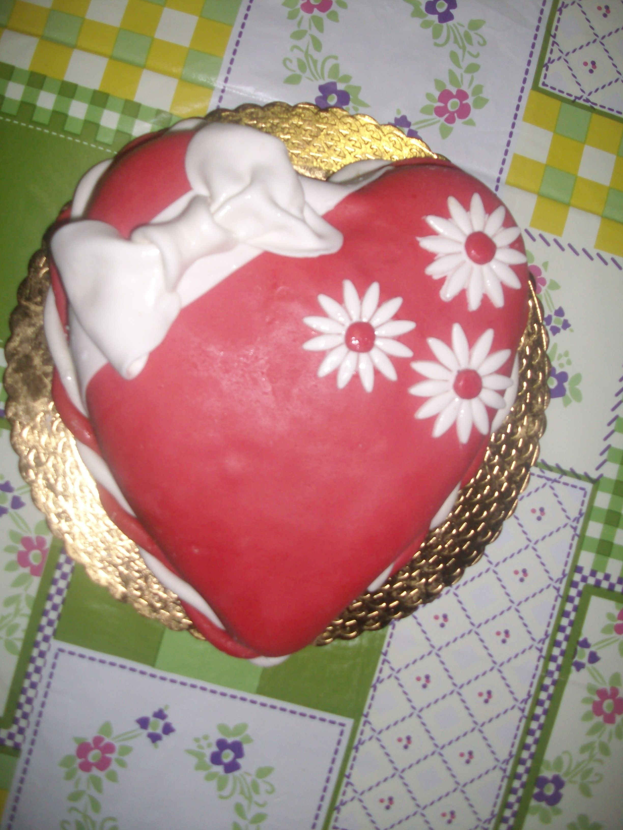 lo farcito con crema pasticciera da un litro di latte dopo che era pronta lo divisa in 2 parti e in 1 ho a ggiunto la cioccolata el`altra lo lasciata gialla.ho usato una tortiera a forma di cuore lo tagliato in 2 parti lo bagnato con un po di martini rosso