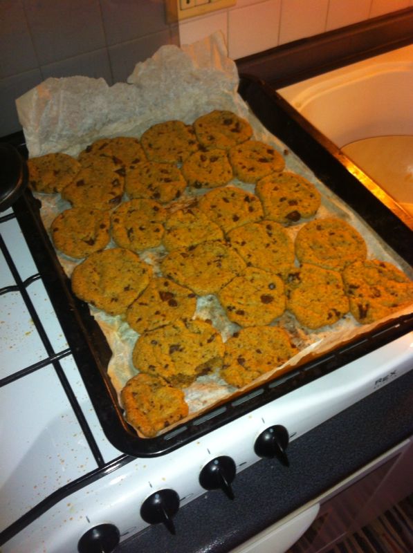 Incorporate all'impasto la farina e il bicarbonato mescolando bene, aggiungete il cioccolato a pezzettini. Foderate una teglia con un foglio di carta da forno e ponete un cucchiaino di impasto per ogni biscotto. Continuate così, distanziando i mucchietti, fino a formare tutti i biscotti, cuoceteli in forno caldo a 180° per circa 15 minuti.